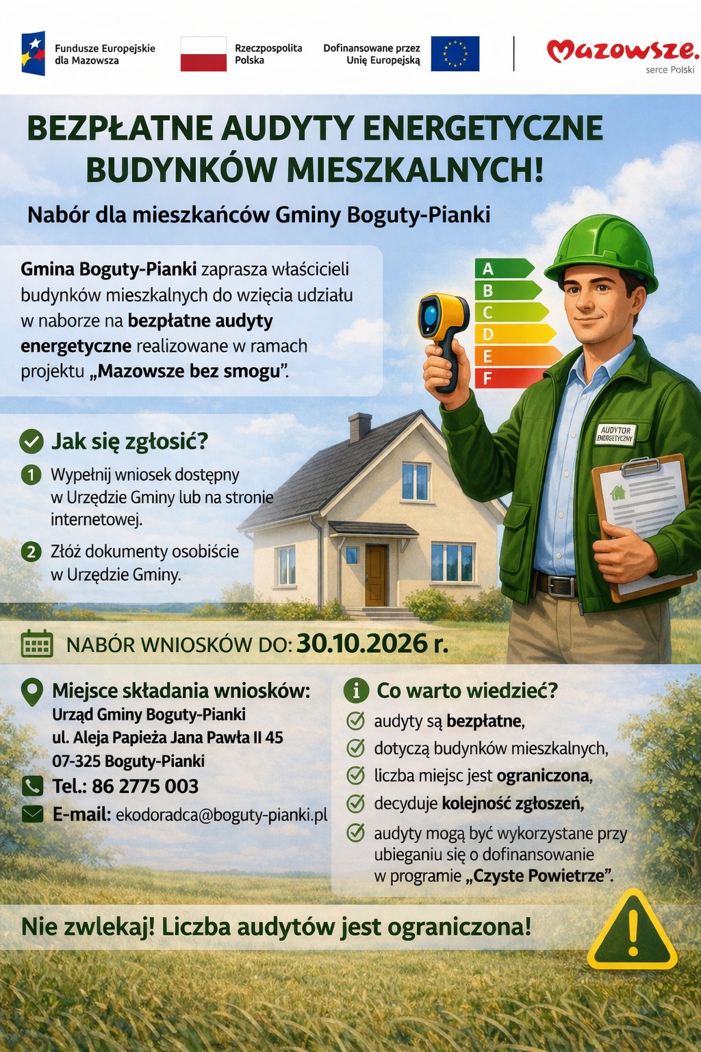 Zapraszamy na spotkanie szkoleniowo-informacyjne programu "Czyste Powietrze" w dniu 19 stycznia 2026 r. godz. 12.00 w sali konferencyjnej Urzędu Gminy Boguty-Pianki.